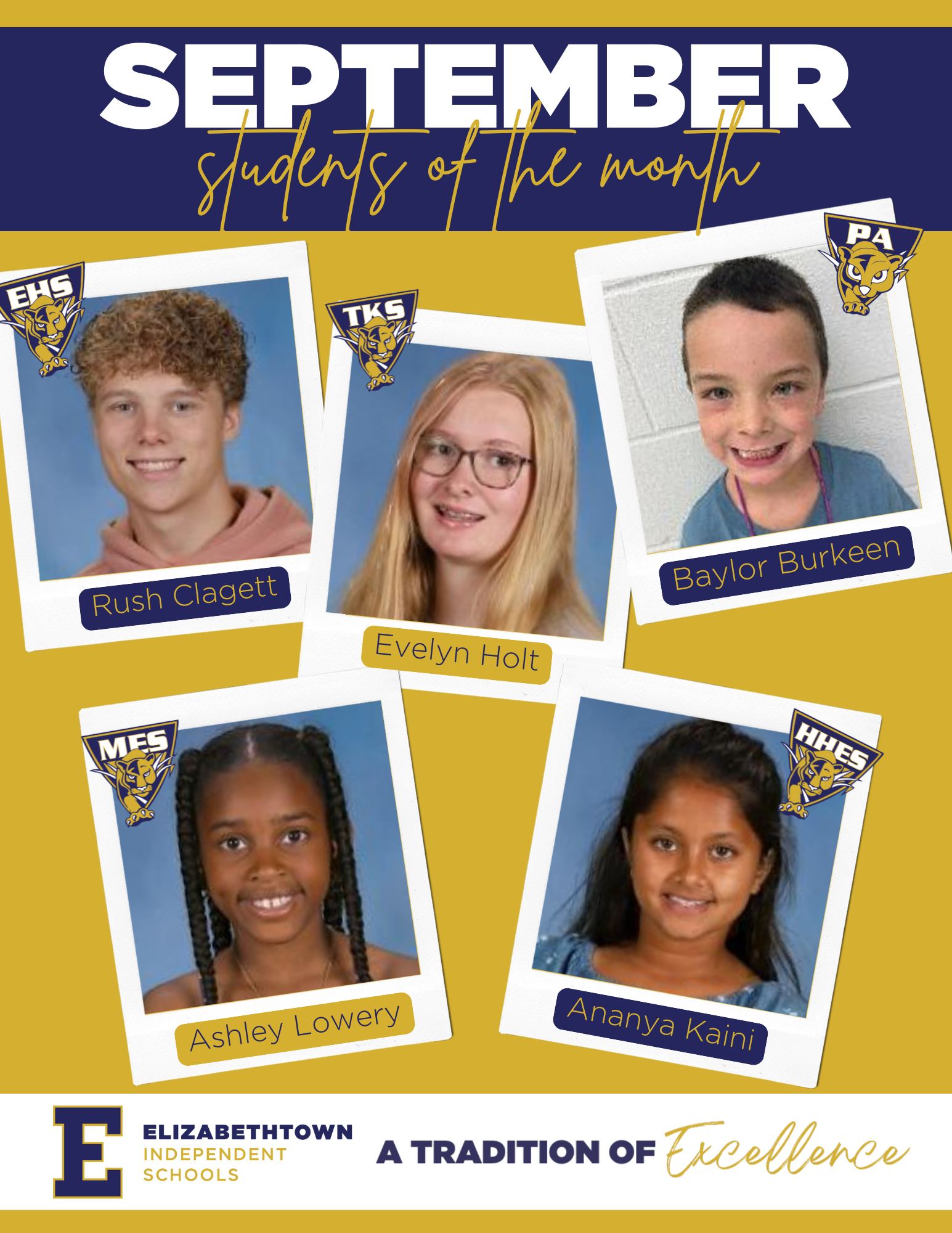 Mrs. Carla Kuhn introduced Baylor Burkeen and gave a brief description of his accomplishments. Mr. Aaron Howell introduced Ananya Kaini as the Helmwood Heights Elementary Student of the Month and gave a brief description of her accomplishments. Mrs. Heather Goodman introduced Ms. Ashley Lowery as the Morningside Elementary Student of the Month and gave a brief description of her accomplishments. Ms. Teri Lynn Dandy introduced Evelyn Holt as T.K.Stone Middle School's Student of the month and gave a brief description of her accomplishments. Mr. Josh Henderson introduced Rush Clagett as the Elizabethtown High School Student of the Month and gave a brief description of his accomplishments.