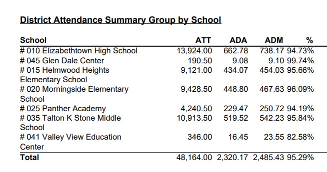 Attached are the SBDM Written Reports from Elizabethtown High School, Helmwood Heights Elementary, Morningside Elementary, TK Stone and Panther Academy for review.