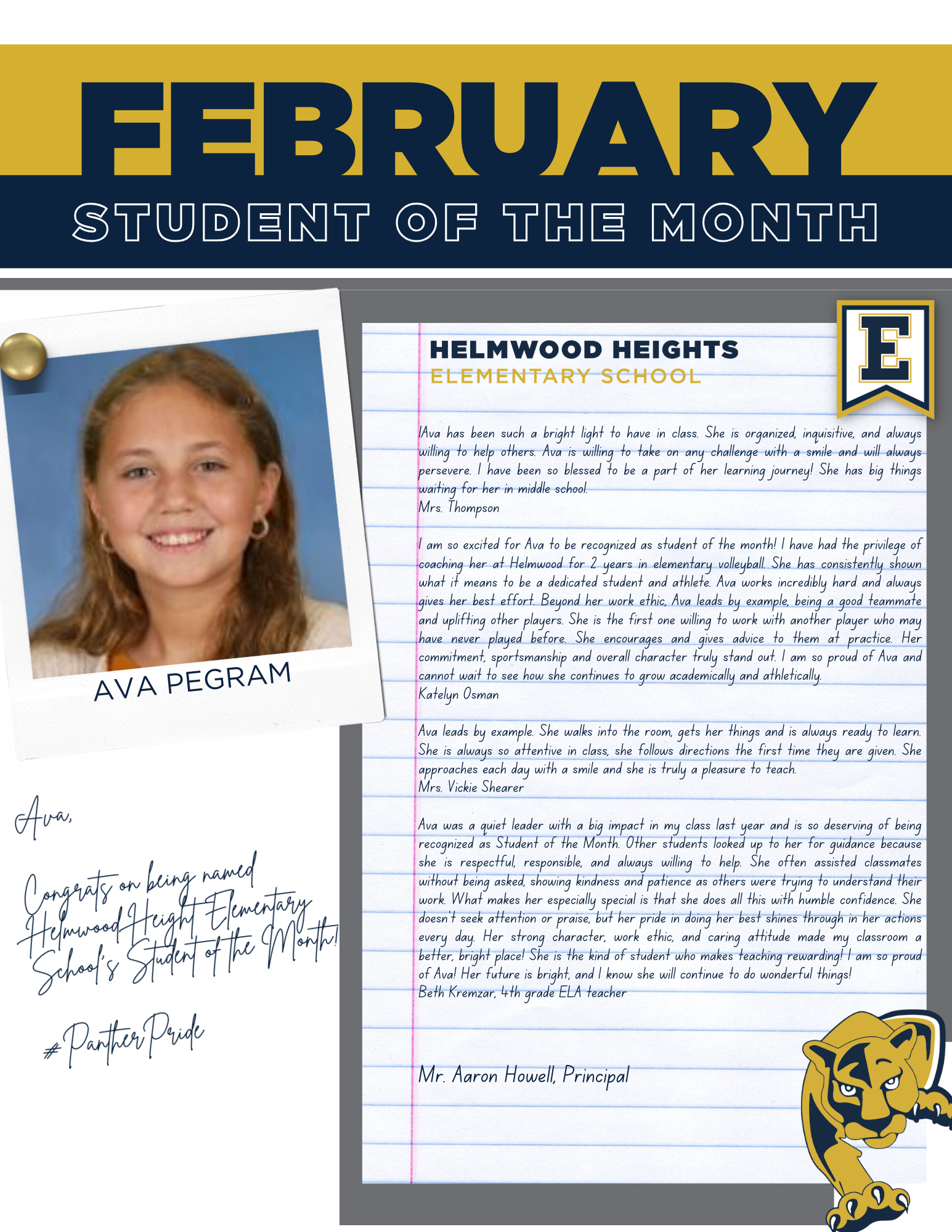 Mrs. Carla Kuhn introduced Lula Norwood as Panther Academy's Student of the Month and gave a description of her accomplishments and achievements. Mr. Aaron Howell introduced Malone Wallace as Helmwood Heights Student of the Month. He gave a brief description of her accomplishments and achievements. Mr. Howell also introduced Ava Pegram as February's Student of the Month for Helmwood Heights and gave a brief description of her achievements and accomplishments. Mrs. Heather Goodman introduced Scarlett Warren as Morningside Elementary's Student of the Month and gave a brief description of her accomplishments and achievements. Mrs. Hope Janes introduced Carter Willett as T.K. Stone Middle School's Student of the Month and gave a brief description of his achievements and accomplishments. Mrs. Janae Bell said that Diego Sanchez could not be in attendance due to illness, but will attend the meeting in April.